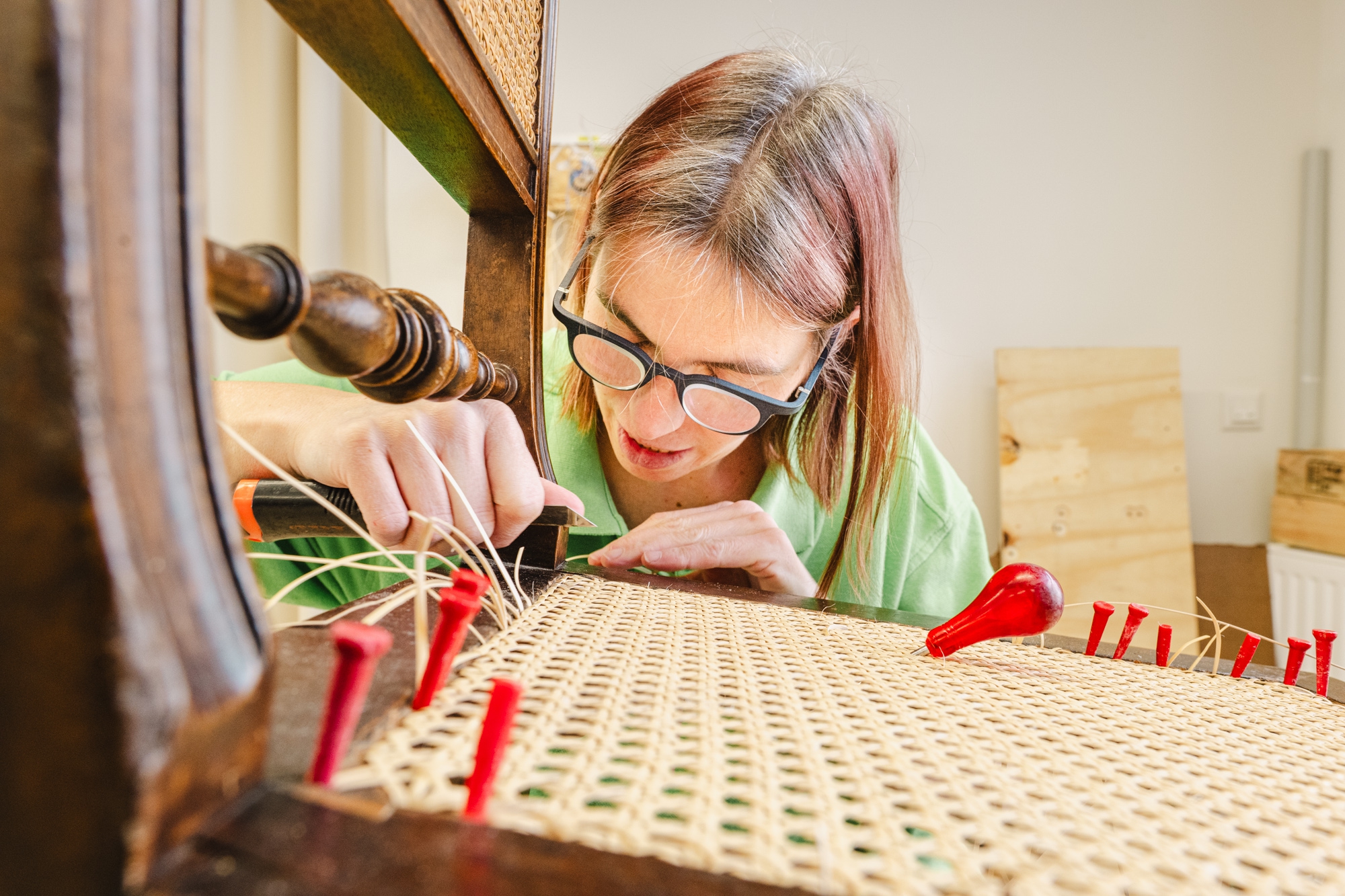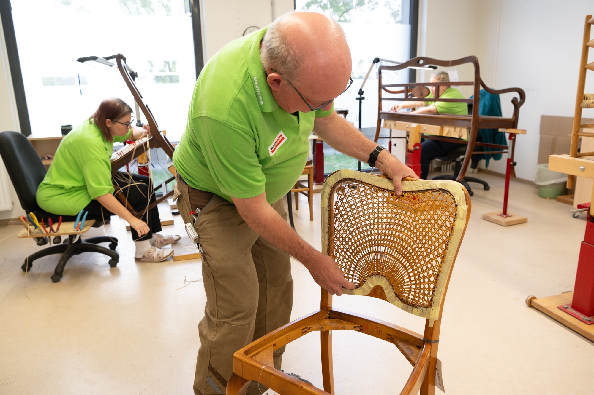 Die Mitarbeiter:innen unserer Möbelflechterei sind mit den verschiedensten Flechttechniken bestens vertraut.